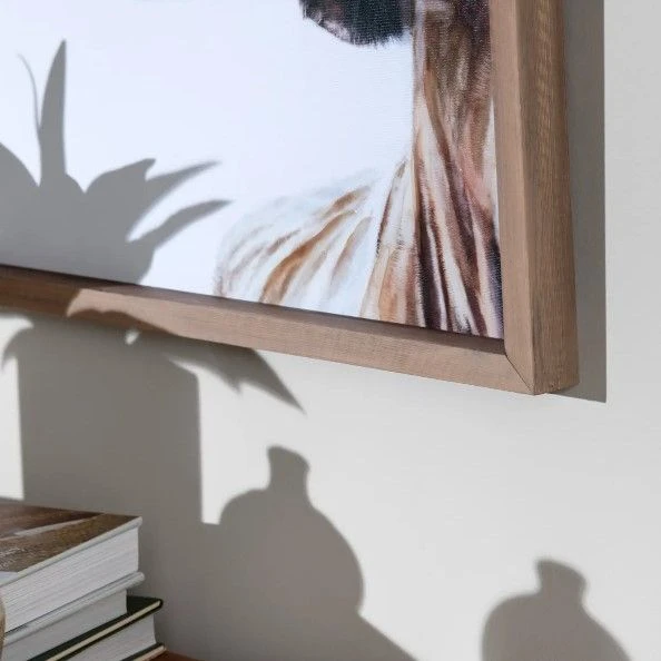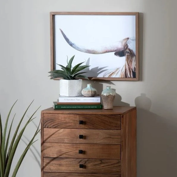 The Texas Longhorn is an iconic symbol of the American Southwest, and this painting captures its rugged beauty perfectly. The painting is framed in a beautiful brown rustic frame, adding a touch of warmth and charm to the overall design.