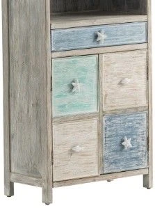 Key west storage cabinet feature nautical design hardware. Multi color drawers and doors for a touch of color in grey driftwood finish