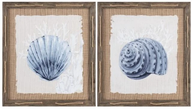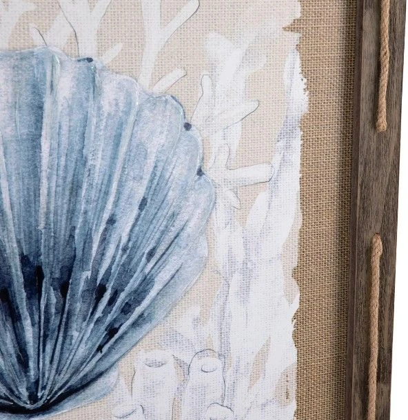 The artwork is framed in a weathered wooden frame, adding a touch of rustic charm and enhancing the natural look and feel of the paintings. The frames are adorned with delicate rope detailing, giving the set a nautical feel that is perfect for any coastal or beach-inspired decor.