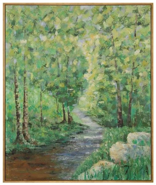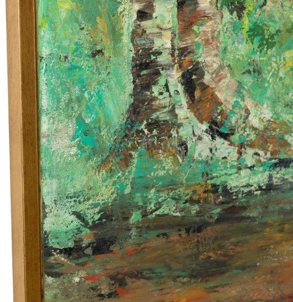 Crafted on high-quality canvas material, this painting boasts intricate details of the trees and the flowing water, creating a sense of depth and dimension that brings the beauty of nature into your living room, dining room, or bedroom. The heavy paint adds a beautiful and unique texture that enhances the overall design. The painting is framed in a beautiful antique gold frame, adding a touch of elegance and sophistication to the overall design.