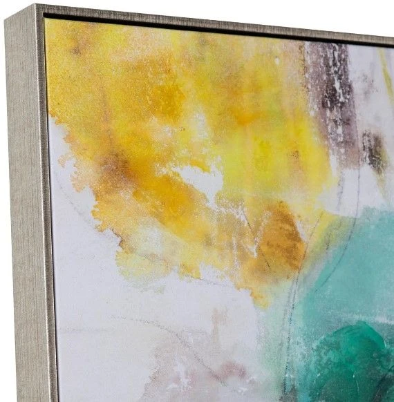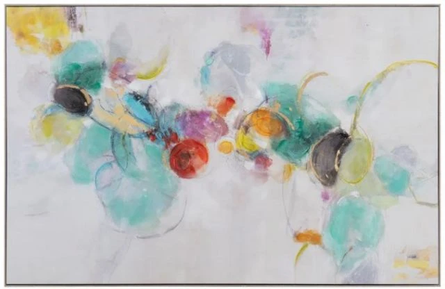 The clean white background provides a perfect backdrop for the colorful circles, creating a beautiful contrast that is both eye-catching and refreshing. Measuring 60×40″, this painting is the perfect size for adding a pop of color to any space. It’s ideal for brightening up a living room, bedroom, or playroom, and is sure to be loved by adults and children alike. The painting features gold foil embellishments, adding a touch of glamour and elegance to the overall design. The foil adds an extra layer of depth and texture, making the painting even more visually appealing. It comes professionally framed in a sleek silver frame to finish the look.